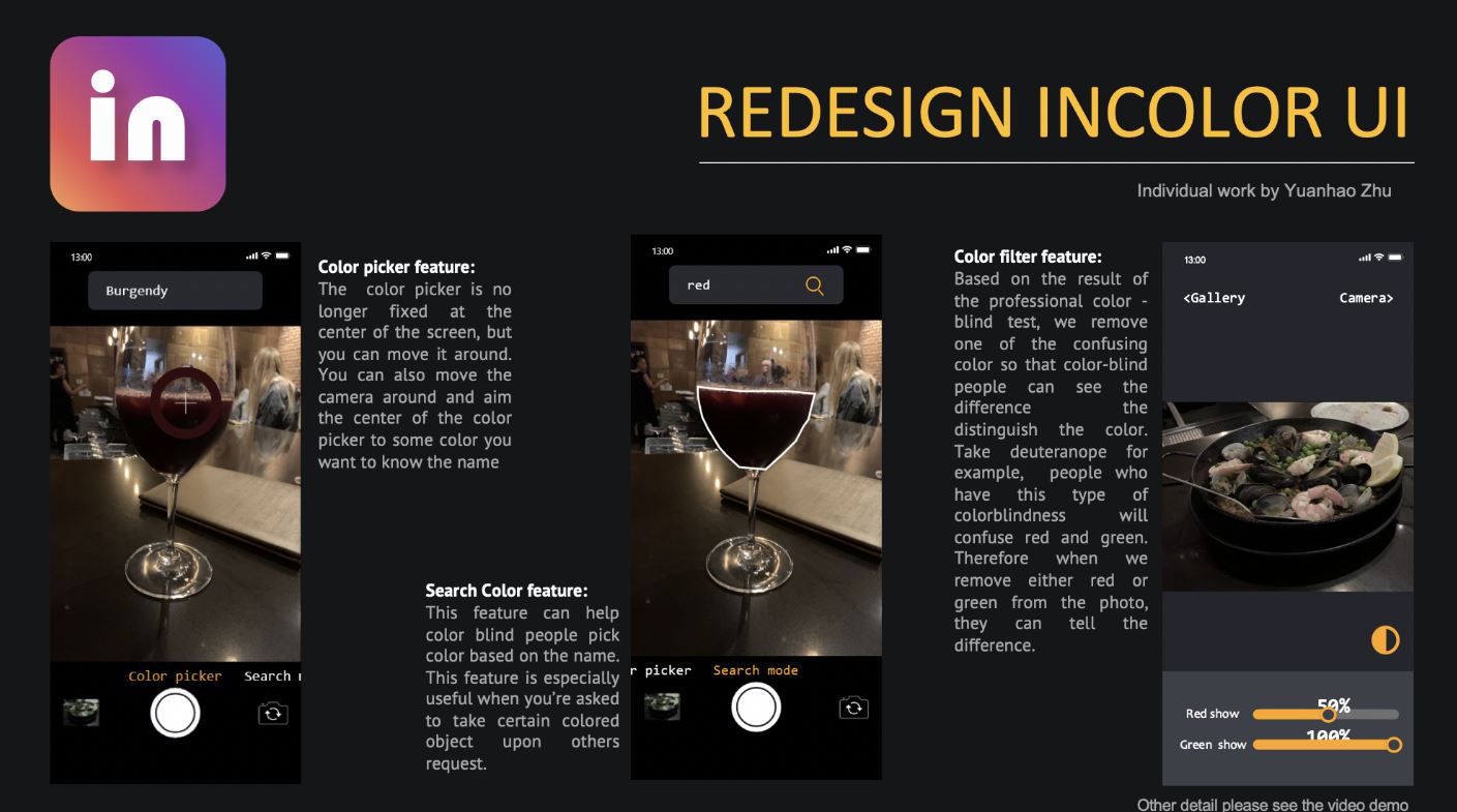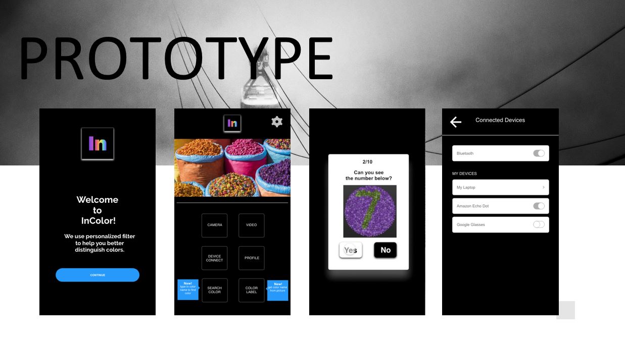Designed a new interface called “InColor” with various color-blind tests and color filters in order to help color blind people more accurately identifying their unique degree of color blindness and to assist them better distinguishing colors when using apps.