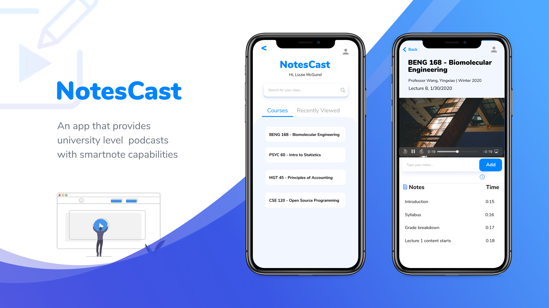 For this project, my team and I worked on the end-to-end iterative process of defining, testing, designing, and developing a mobile-friendly app. To serve the theme of Breaking Barriers to Learning, we created NotesCast, an app for college students aiming to provide note-adding interactive features on video podcasts.Background